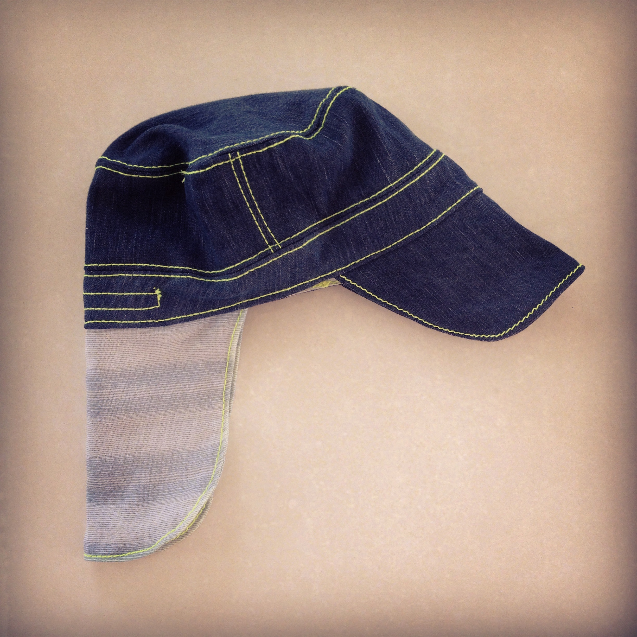 Natuurlijk wil je niets liever dan jouw ukkie beschermen tegen de zon! Dat kan met zo’n superleuk zelfgemaakt babyhoedje. Deze is gemaakt van een restje dunne denim en streepjeskatoen.